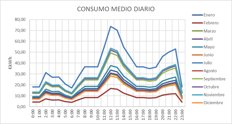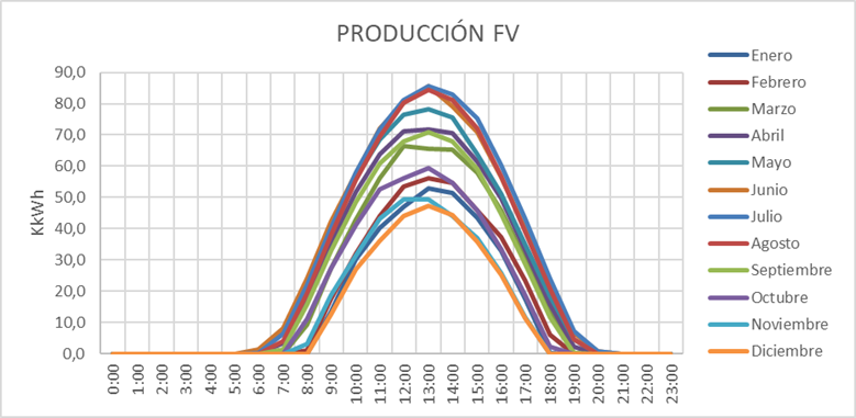 El cruce de las curvas de producción y consumo proporcionaba para cada escenario las curvas de autoconsumo, vertido de excedentes y compra de electricidad, discriminando por días laborables y no laborables, horas del día y meses del año.